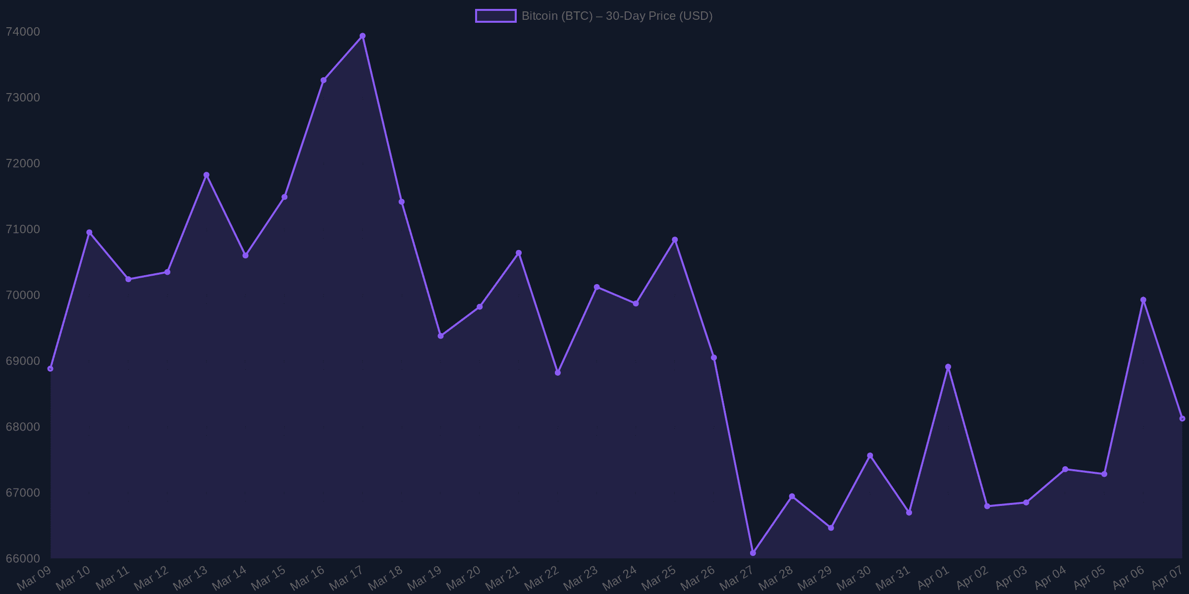 As of April 08, 2026, Bitcoin’s current price stands at $71,158.00 USD, reflecting a 4.64% increase over the past 24 hours. Over the last week, Bitcoin has shown a positive change of 3.76%, and within the past 30 days, it has increased by 3.1%. The 24-hour trading volume is a substantial $54,032,500,196, underscoring the active trading environment surrounding Bitcoin. With a market cap of $1,423,059,514,928, Bitcoin maintains its position as the number one cryptocurrency by market cap, although it remains 43.56% below its all-time high of $126,080.00. The 24-hour high/low range of $72,698/$68,005 highlights the ongoing volatility in Bitcoin’s market.